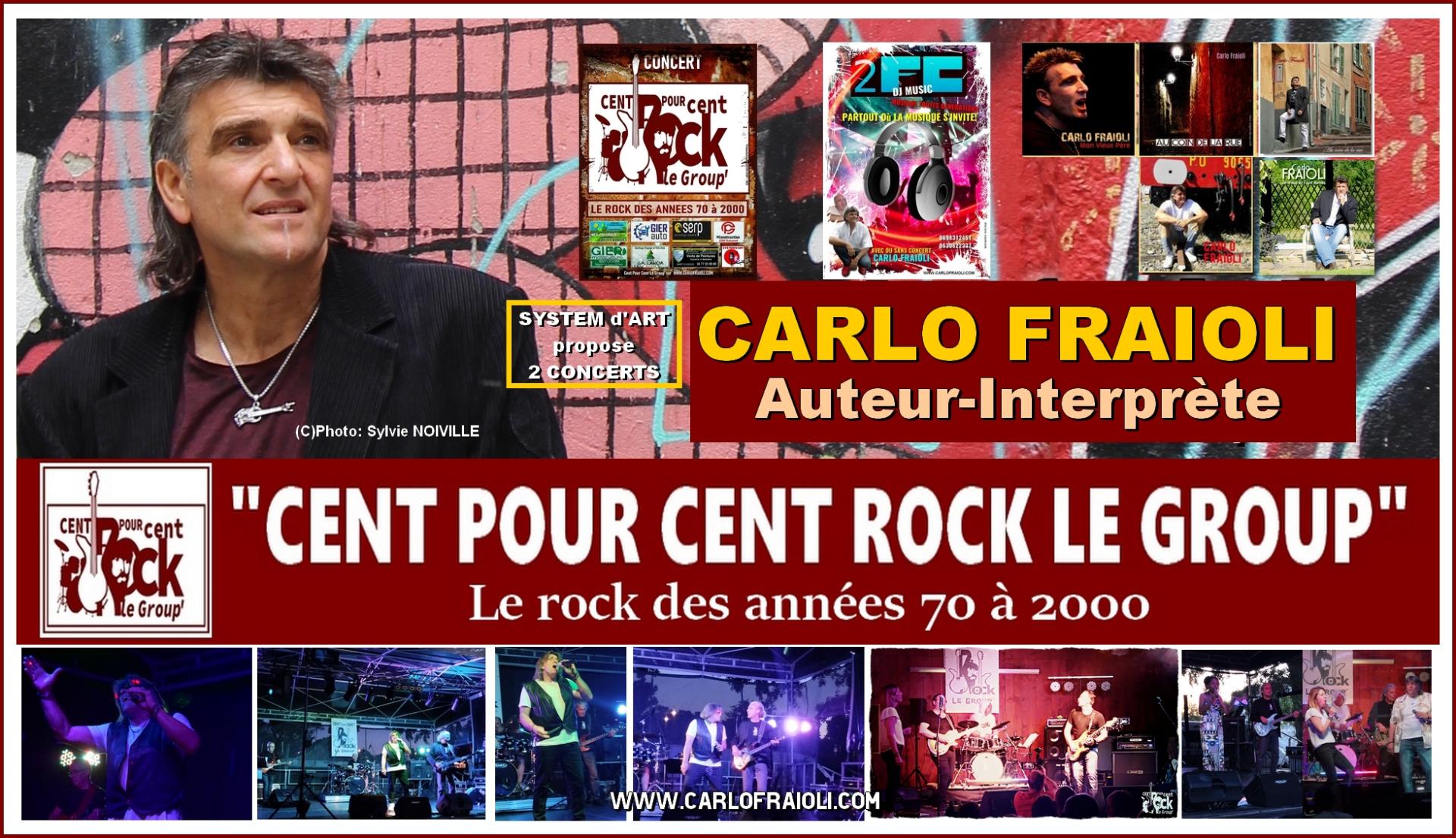 CARLO FRAIOLI, c'est aussi le groupe CENT POUR CENT ROCK LE GROUP' qui se produt en concert avec ses musiciens et chanteuse. “Cent Pour Cent Rock” a été créé en 2022. Le groupe est composé de 2 guitaristes, 1 bassiste, 1 batteur, 1 chanteuse, 1 chanteur, et un ingénieur son et lumières. Leur répertoire est une combinaison de chansons rock des années 70 à 2000, avec des chansons à la fois en français et en anglais. Le groupe est autonome sur scène et se produit lors de diverses manifestations festives locales et privées, ainsi que lors de concerts.